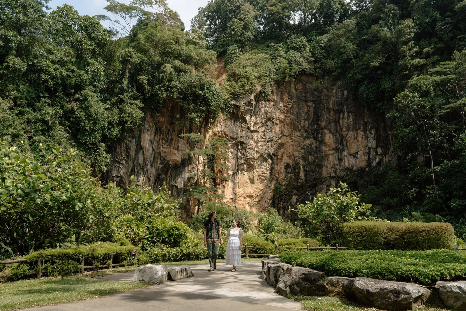 Fun fact: G & S work in conservation of Singapore’s nature areas, and we got quite the nature lesson during this engagement shoot as they pointed out all the plants we saw along the way, the animals (a monitor lizard! sadly, no monkeys were present that day) & the many different bird calls that greeted us during the hour. Our shoot eventually took us to a beautiful quarry setting with towering rock faces covered in lush greenery.